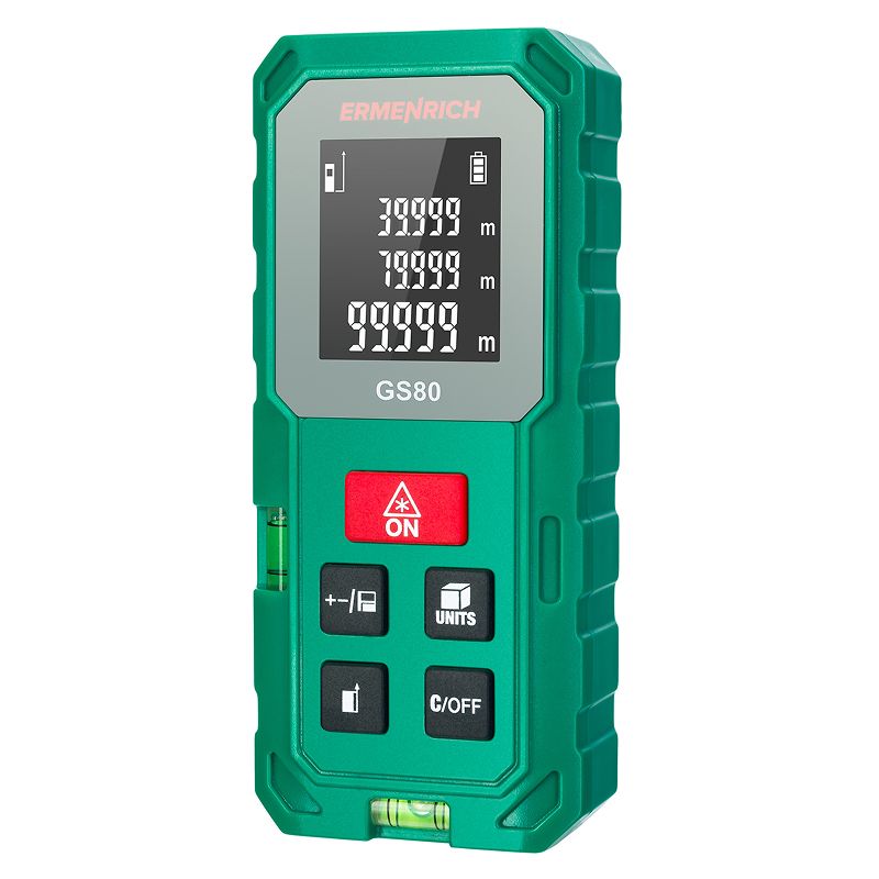 Ermenrich Reel PLUS GS80 оснащена функцией «Пифагор», позволяющей рассчитывать недоступные расстояния по теореме Пифагора, что особенно актуально при работе в труднодоступных местах. Также доступны операции сложения и вычитания измерений, что упрощает вычисления на месте. Точка отсчета может быть выбрана как с передней, так и с задней части корпуса, включая верхнюю и нижнюю ориентацию, что повышает гибкость при проведении замеров.