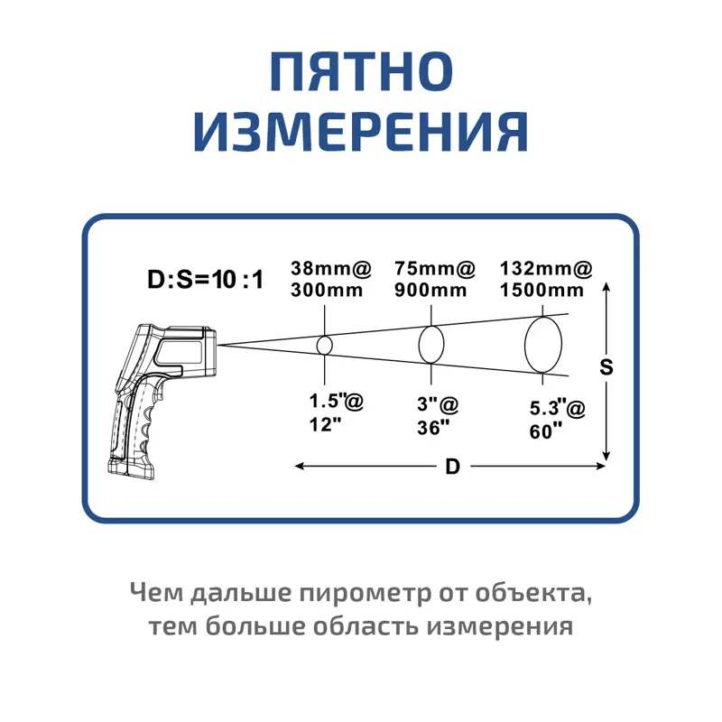 Рабочий спектральный диапазон прибора составляет от 8 до 14 микрометров, что соответствует типичному диапазону теплового излучения большинства материалов. Предустановленный коэффициент излучения настраиваемый в диапазоне от 0,1 до 1,0, что оптимально для большинства бытовых и промышленных поверхностей, и избавляет пользователя от необходимости вручную настраивать прибор под разные объекты. Оптическое разрешение 12:1 означает, что с расстояния 12 см можно измерять температуру объекта диаметром 1 см, что повышает точность в работе с мелкими или удалёнными элементами.