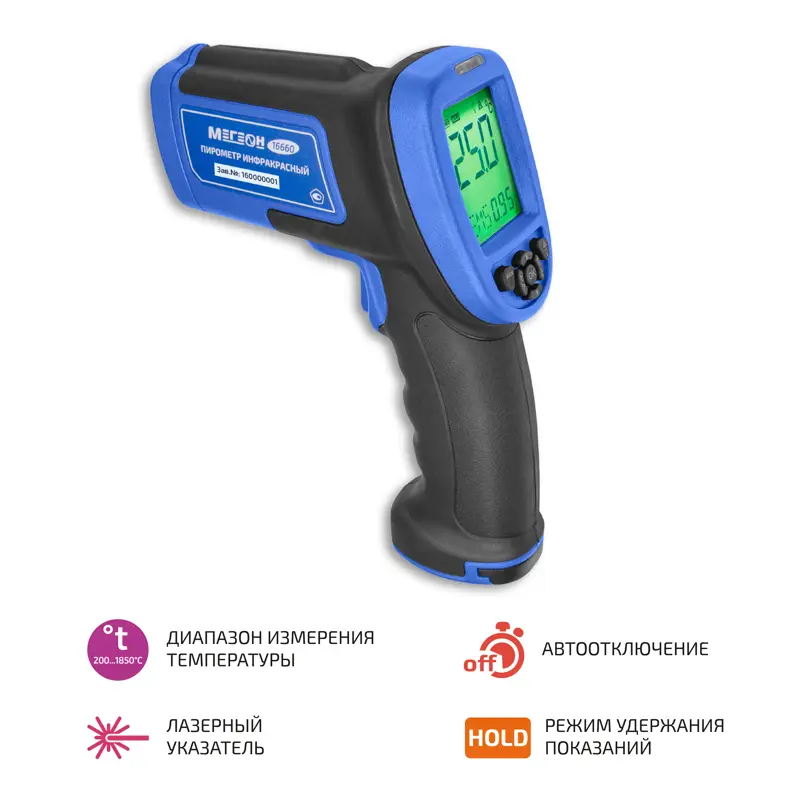 Для удобства пользователя предусмотрена функция автоматического отключения: прибор выключается примерно через 20 секунд бездействия, что помогает экономить заряд батареи. Всё это делает пирометр МЕГЕОН 16660 надёжным и удобным инструментом для точной диагностики температурных режимов без контакта с измеряемой поверхностью.