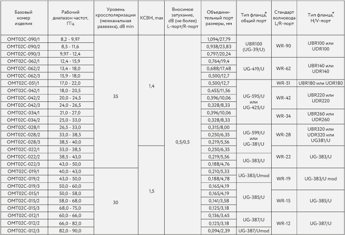 СЕРИЯ ОМТ02С субдиапазонные поляризационные селекторы круговой поляризации (частотный диапазон по стандартному сечению круглого волновода) от 8,2 до 90 ГГц.Тип общего порта: волновод круглого сечения;
